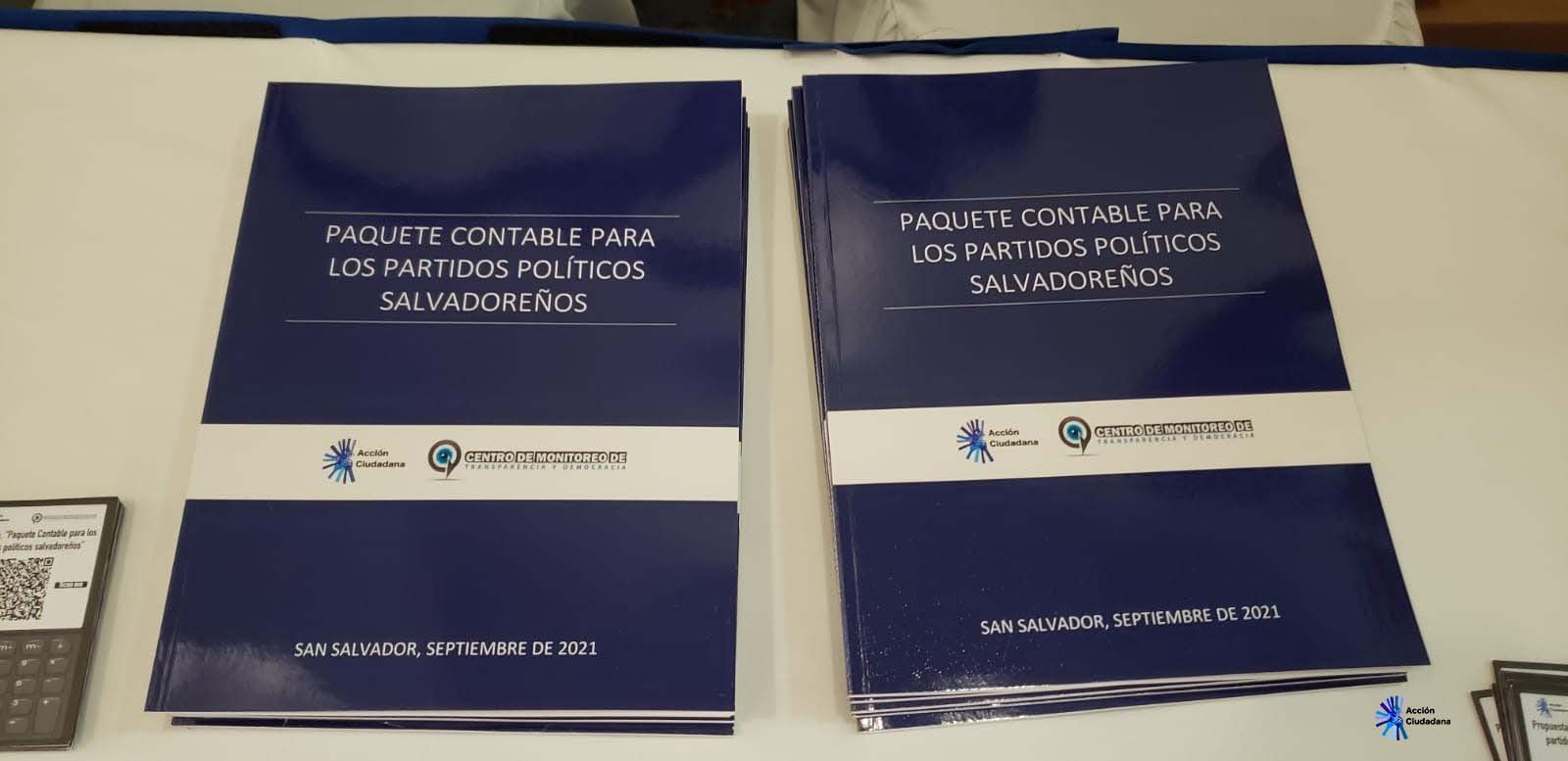 Acción Ciudadana, en su labor de contraloría al financiamiento de la política salvadoreña que ha realizado desde el año 2016 y consciente en la necesidad de fortalecer la transparencia en el financiamiento de la política, ha elaborado la propuesta: “paquete contable para los partidos políticos políticos salvadoreños”, documento que contiene una política de transparencia, un catálogo contable, un manual de aplicaciones, un manual de buenas prácticas contables y formatos de registro para que sean usados por los partidos.
